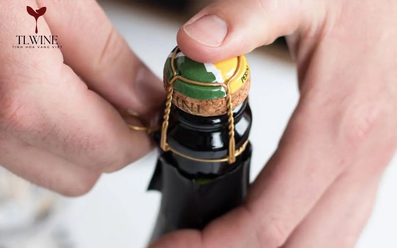 Luôn đặt ngón tay cái lên đỉnh nút bần để kiểm soát lực. Tay còn lại xoay vòng kim loại ngược chiều kim đồng hồ cho đến khi dây lỏng ra. Bạn không nhất thiết phải tháo rời hoàn toàn dây kim loại, vì giữ lại sẽ giúp tăng độ bám và an toàn hơn.