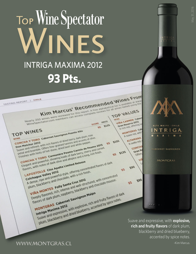 Rượu vang MontGars Intriga Maxima mang hương thơm quyến rũ của quả mâm xôi đen, phúc bồn tử và thuốc lá, hơi mùi da thuộc.Rượu ngon, cấu trúc tốt, thanh lịch, mượt mà và đậm đà mùi trái cây chính là những ưu điểm nổi trội của chai rượu vang này.